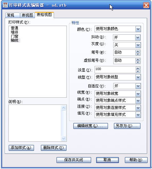 命名相关打印样式表的设置选项跟CTB相同,只是左侧对应的不是颜色,而是我们定义的样式名,如下图所示。默认的STB通常只有一个“普通”样式,其他样式是需要自己添加的,右侧输出特性设置与CTB文件相似。
