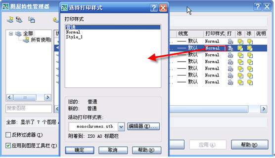 分别打开一个使用CTB和STB的图纸,打开图层管理器,就可以很明显地看出区别了,在使用CTB打印样式的图纸中,图层的“打印样式”一栏是灰色的,不能修改,显示的就是颜色编号,与图层颜色对应,例如设置为白色,样式就显示为color_7。而在使用STB的图中,“打印样式”默认为“Normal”或“普通”,并且是可以编辑的,单击后可以在对话框中选择STB文件中设置好的样式,如下图所示。
