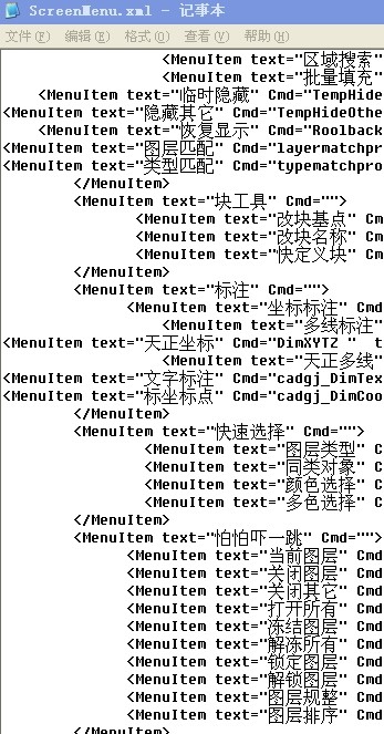 第一步,我们先把我们不要的功能去除,用记事本打开C:\Program Files\CAD好帮手\Config\ScreenMenu.xml,平时我用天正,天正的图层功能不错了,我就把好帮手的图层功能给删除,