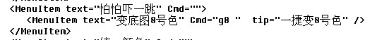 把图层排序名字改为你要扩展命令的名字,比如我要把我的把建筑底图改为8号色的小程序放进去,我就把图层排序 改成了变底图8号色,Cmd=”SortLayer “改为你扩展小程序的命令,我的变底图8号色的快捷键为g8,所以Cmd=”g8 ” ,后面的tip=”排图层显示顺序”,这个就是提示了,我改为,一捷变8号色如图: