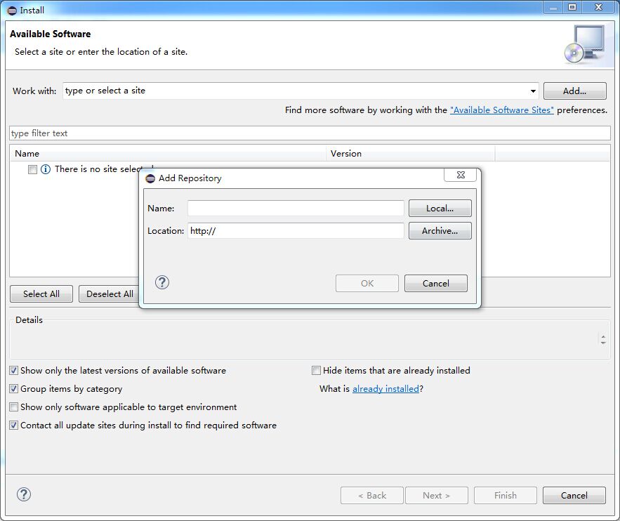启动Eclipse,点击 Help菜单 -> Install New Software… ?,点击 ?Add… ?,输入