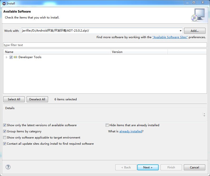 选取要安装的项,一路Next完成安装并重启。这样ADT就安装完毕了。