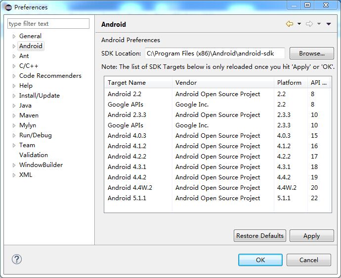 选择 Window -> Preferences ,在弹出面板中就会看到Android设置项,填上安装的SDK路径,则会出现刚才在SDK中安装的各平台包,按OK则完成配置。此时Android的环境就搭建完毕,可以进行Android项目的开发了。