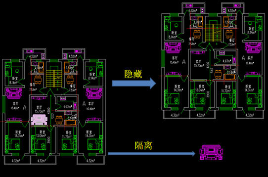 此功能可以让用户直接隔离、隐藏选定对象,不用考虑对象所处图层,在有些情况下比操作图层来得更方便快捷。