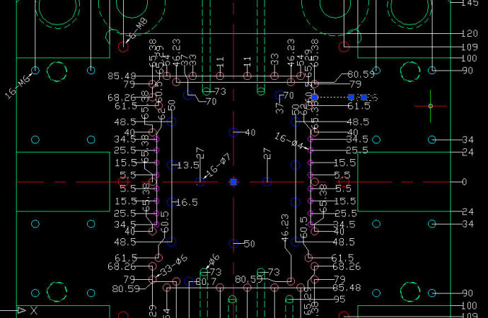 在一些机械零件、模具中有大量的孔或其他图形特征,设计人员通常的做法是在图形中确定一个基点,将UCS原点调整到基点处,然后利用坐标标注来进行尺寸标注。如果结合连续标注,标注非常快,而且图面也很整齐,如下图所示: